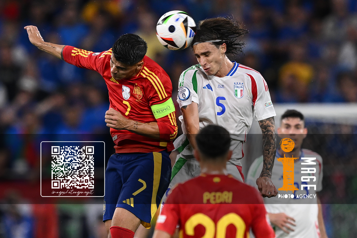 Mg Gelsenkirchen (Germania) 20/06/2024 - Euro 2024 / Spagna-Italia / foto Image Sport nella foto: Alvaro Morata-Riccardo Calafiori