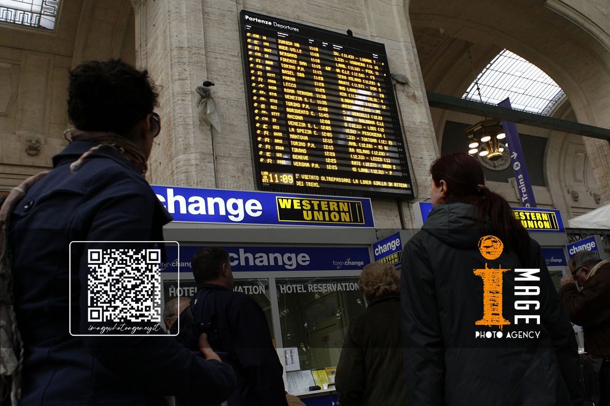 passeggeri osservano tabellone partenze alla stazione Centrale Ferrovie dello Stato a Milano