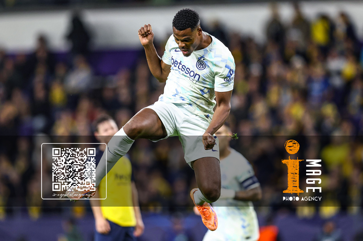 Bruxelles (Belgio) 21/10/2025 - Champions League / Saint Gilloise-Inter / foto Imago/Image Sport nella foto: esultanza gol Denzel Dumfries ONLY ITALY