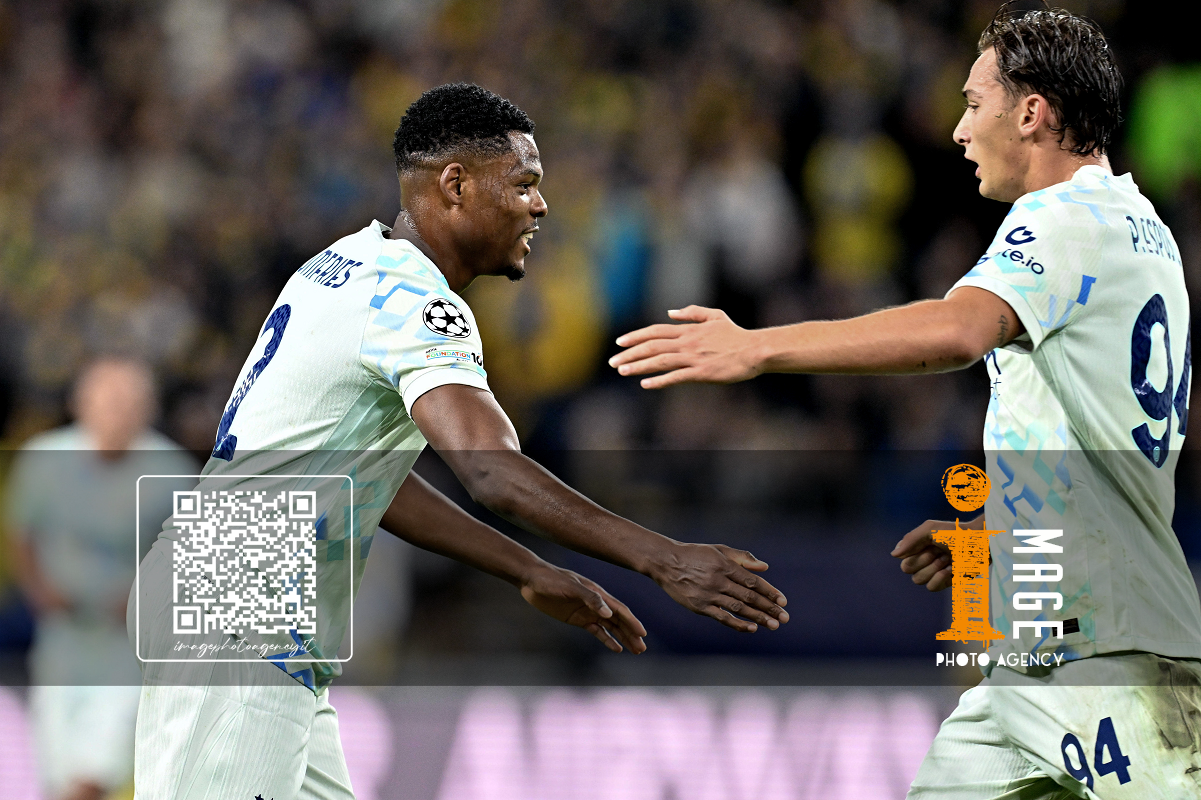 Bruxelles (Belgio) 21/10/2025 - Champions League / Saint Gilloise-Inter / foto Imago/Image Sport nella foto: esultanza gol Denzel Dumfries ONLY ITALY
