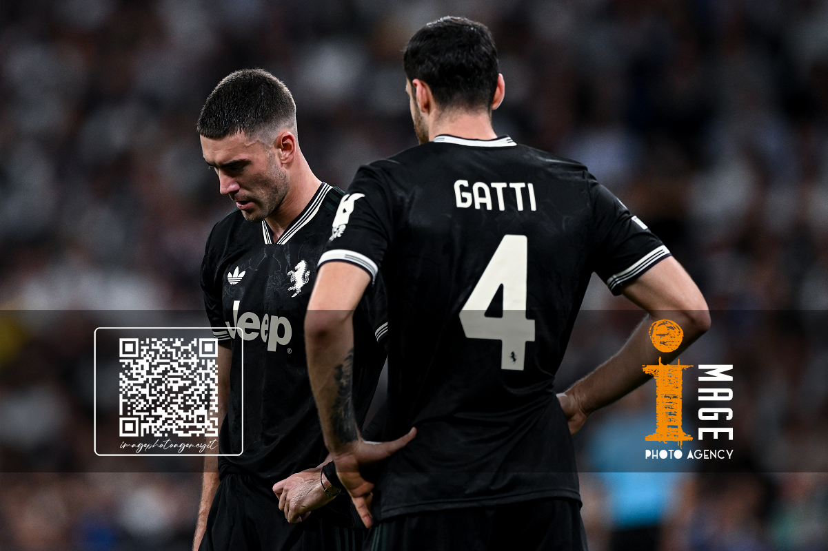 Mg Madrid 22/10/2025 - Champions League / Real Madrid-Juventus / foto Matteo Gribaudi/Image Sport nella foto: Dusan Vlahovic-Federico Gatti