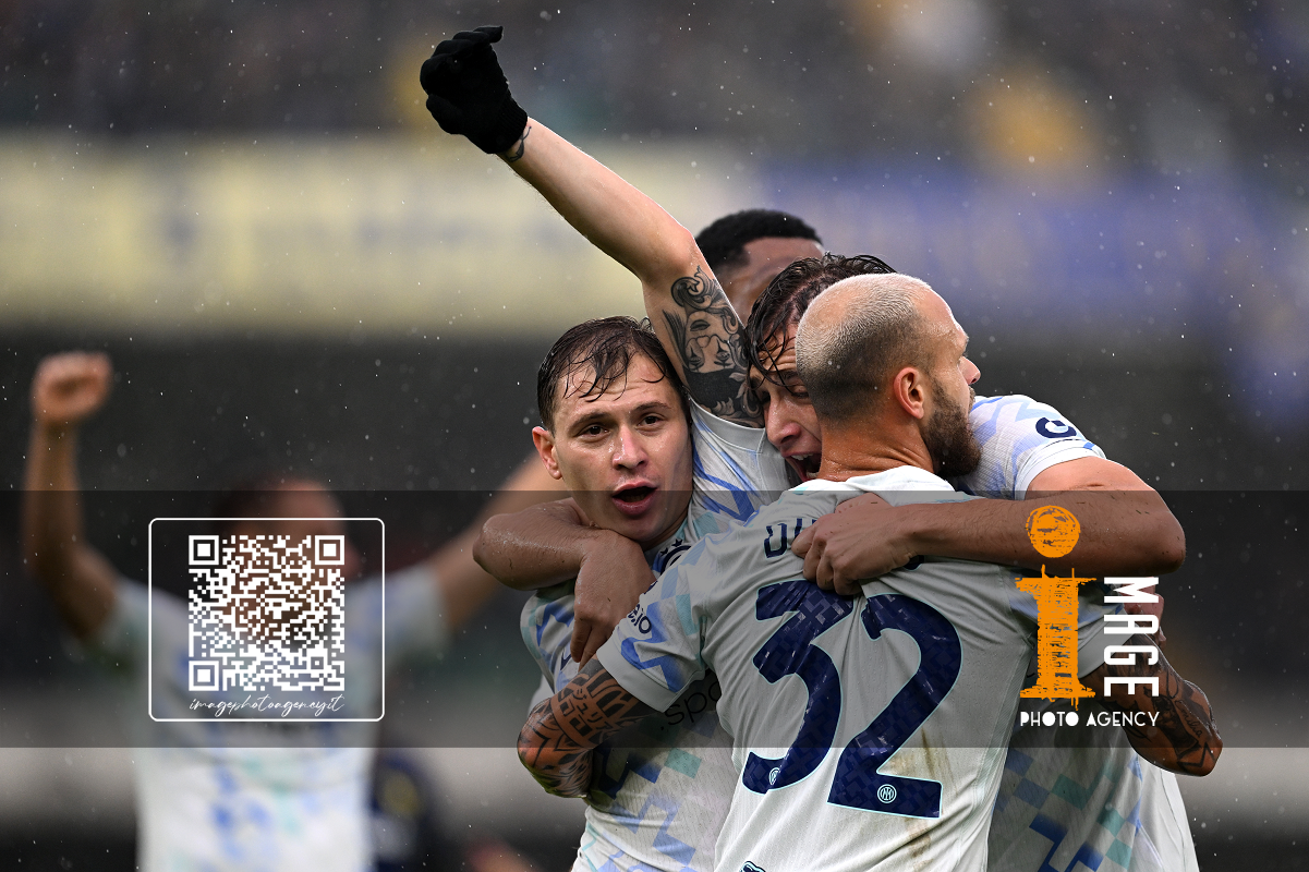 Mg Verona 02/11/2025 - campionato di calcio serie A / Hellas Verona-Inter / foto Matteo Gribaudi/Image Sport nella foto: Nicolo’ Barella-Pio Esposito-Federico Dimarco