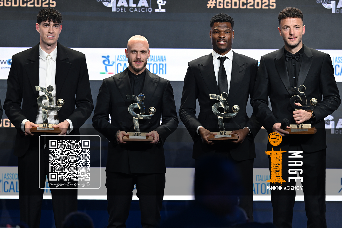 Db Milano 01/12/2025 - Gran Gala' del Calcio Aic 2025 / foto Daniele Buffa/Image Sport nella foto: Alessandro Bastoni-Federico Dimarco-Denzel Dumfries-Amir Rrahmani
