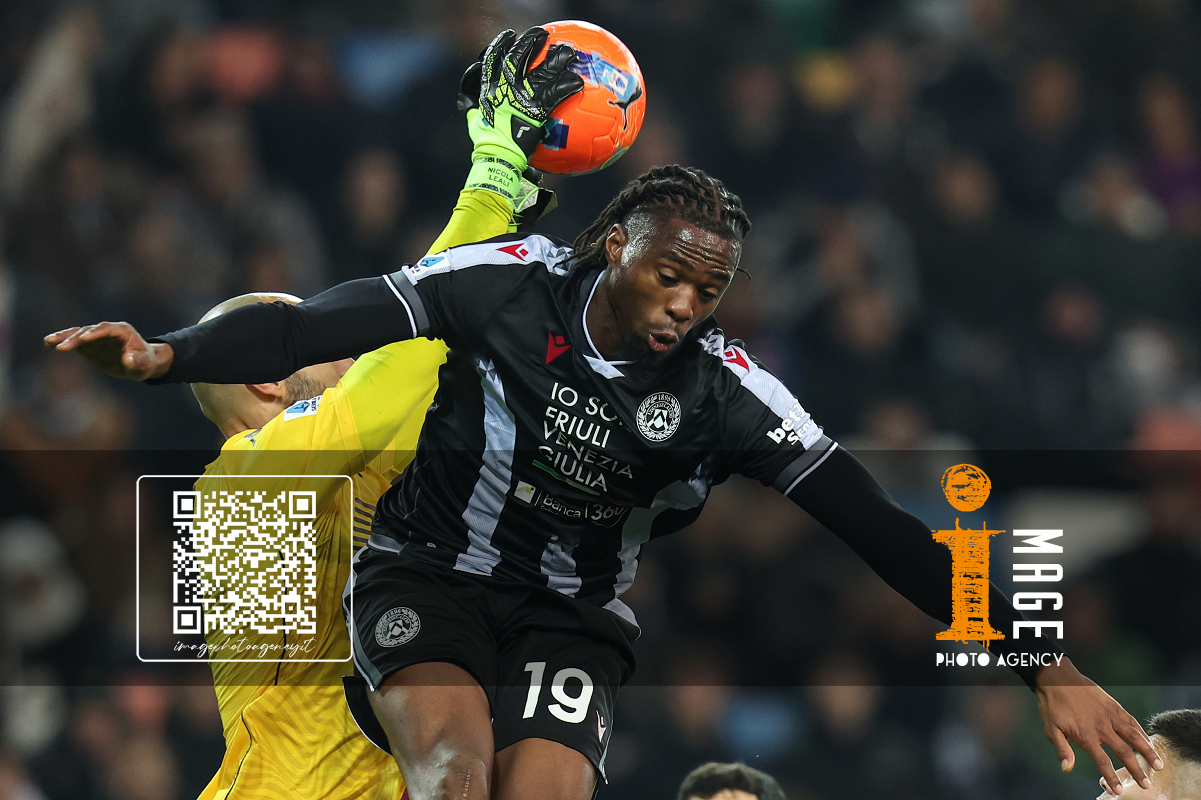 Ar Udine 08/12/2025 - campionato di calcio serie A / Udinese-Genoa / foto Andrea Rigano/Image Sport nella foto: Nicola Leali-Kingsley Ehizibue