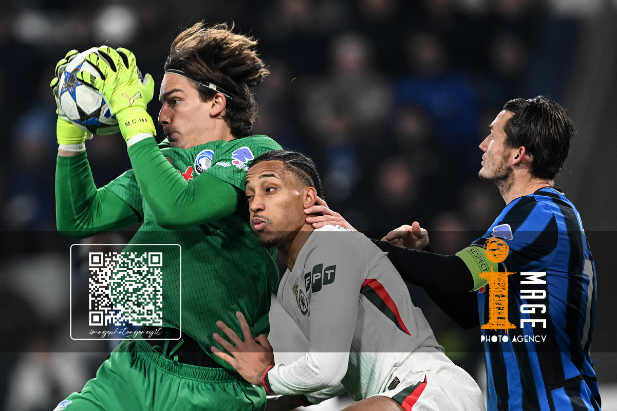 Mg Bergamo 09/12/2025 - Champions League / Atalanta-Chelsea / foto Matteo Gribaudi/Image Sport nella foto: Marco Carnesecchi-Joao Pedro-Marten de Roon