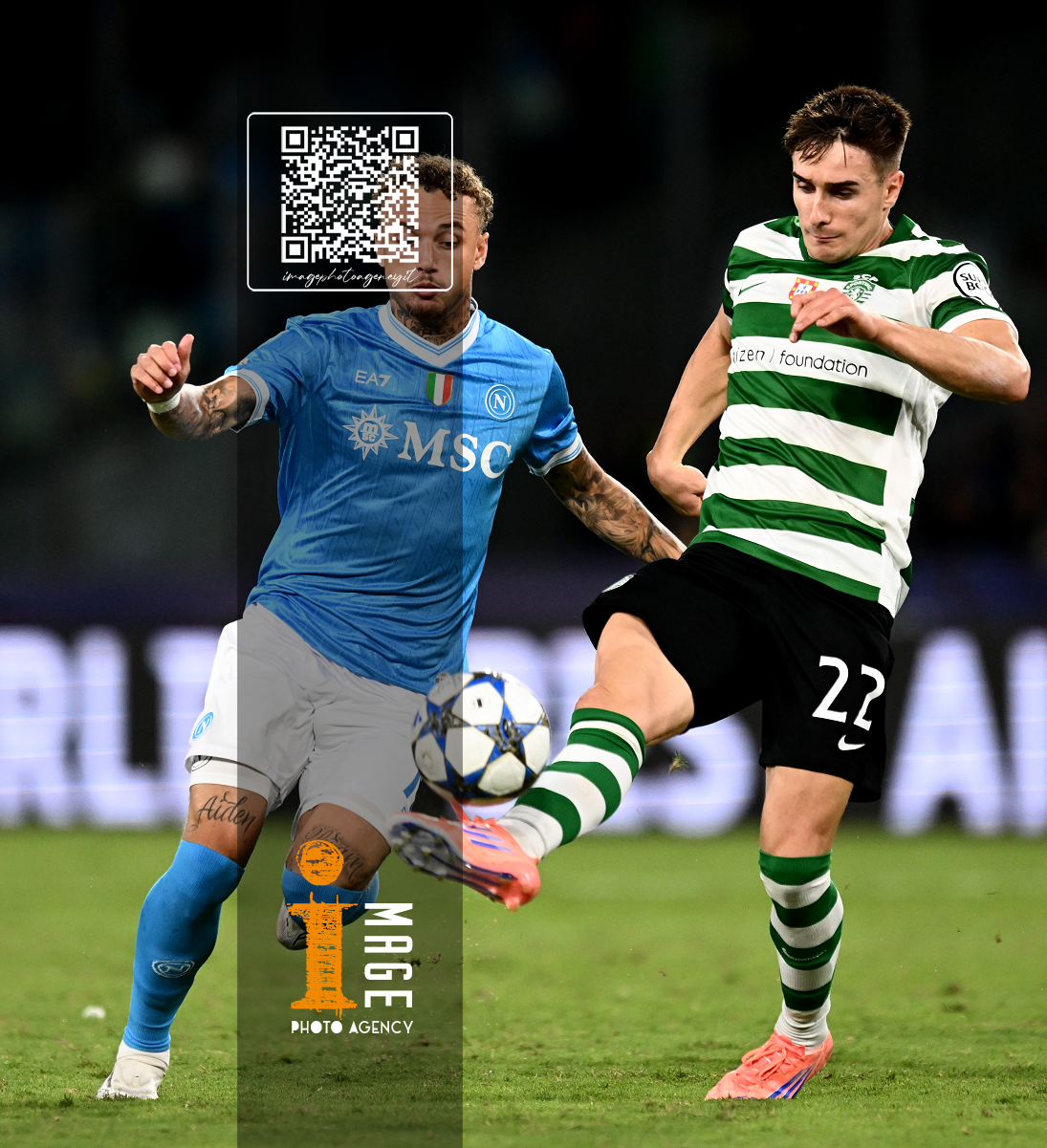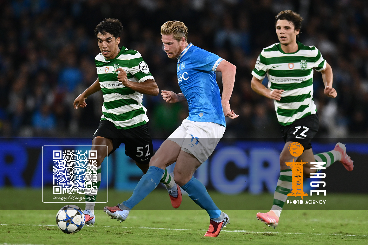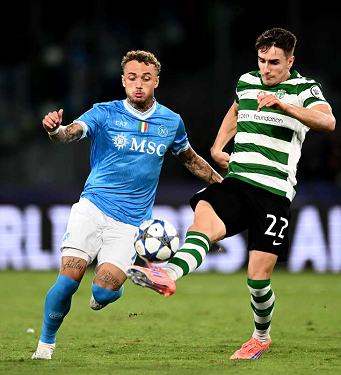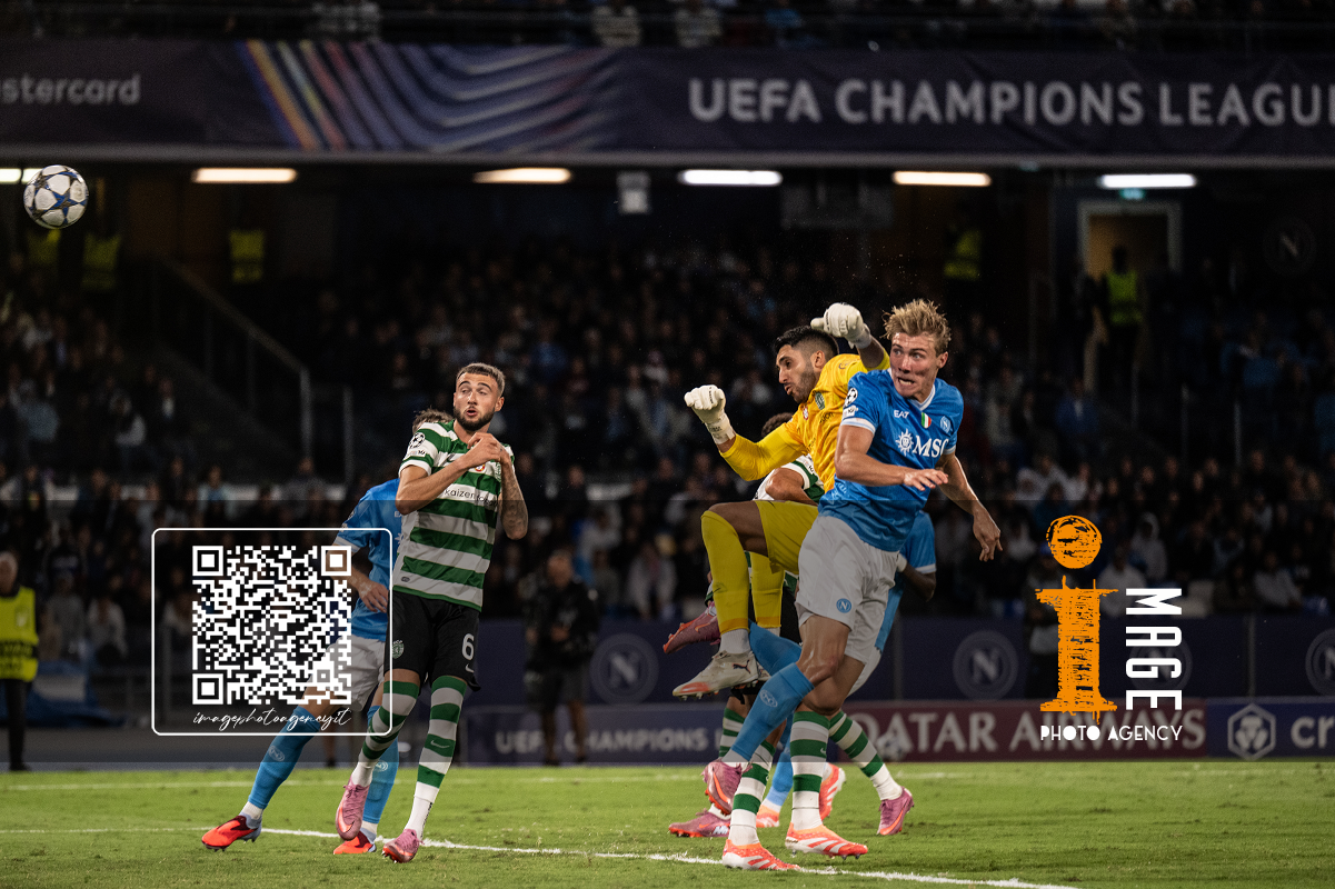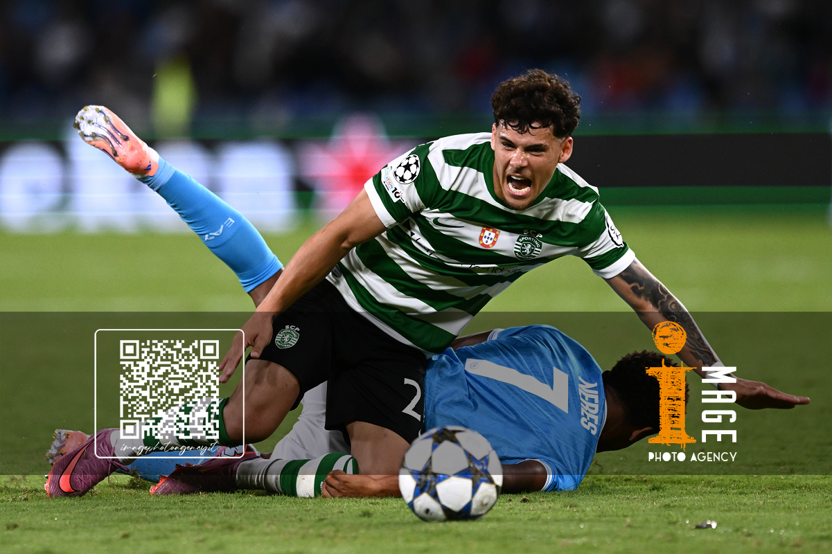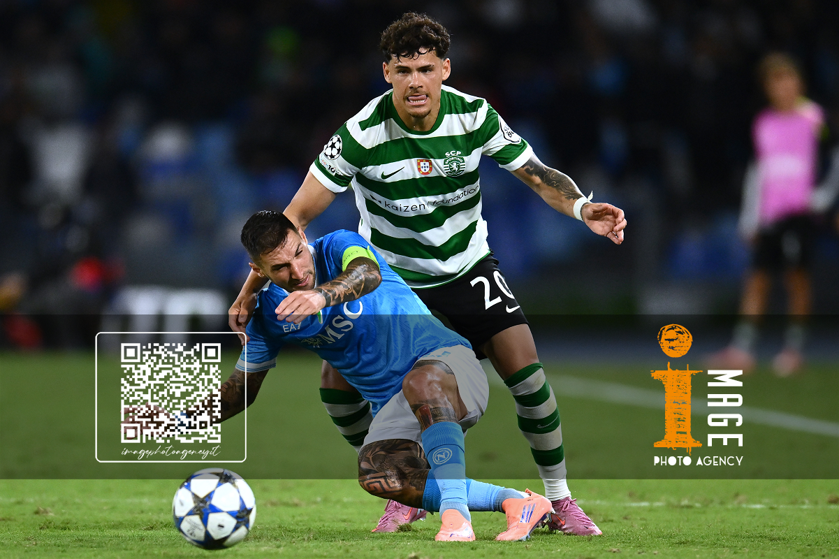 Dc Napoli 01/10/2025 - Champions League / Napoli-Sporting Lisbona / foto Domenico Cippitelli/Image Sport nella foto: Matteo Politano-Maximiliano Araujo