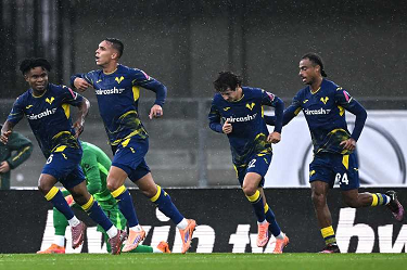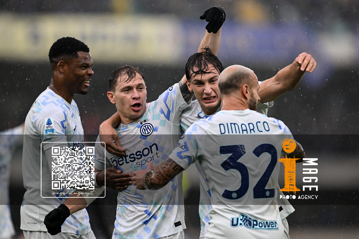 Mg Verona 02/11/2025 - campionato di calcio serie A / Hellas Verona-Inter / foto Daniele Buffa/Image Sport nella foto: esultanza Pio Esposito-Nicolo' Barella-Federico Dimarco-Denzel Dumfries