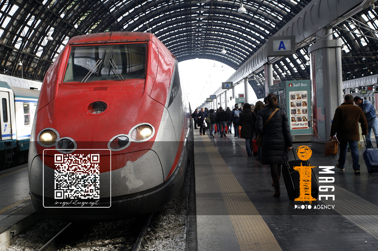 treno e passeggeri sul binario della stazione Centrale Ferrovie dello Stato a Milano