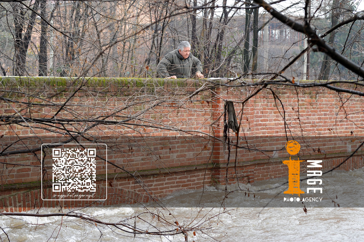 passante osserva gli argini del fiume Lambro in piena nelle vicinanze della cascina Monlue'